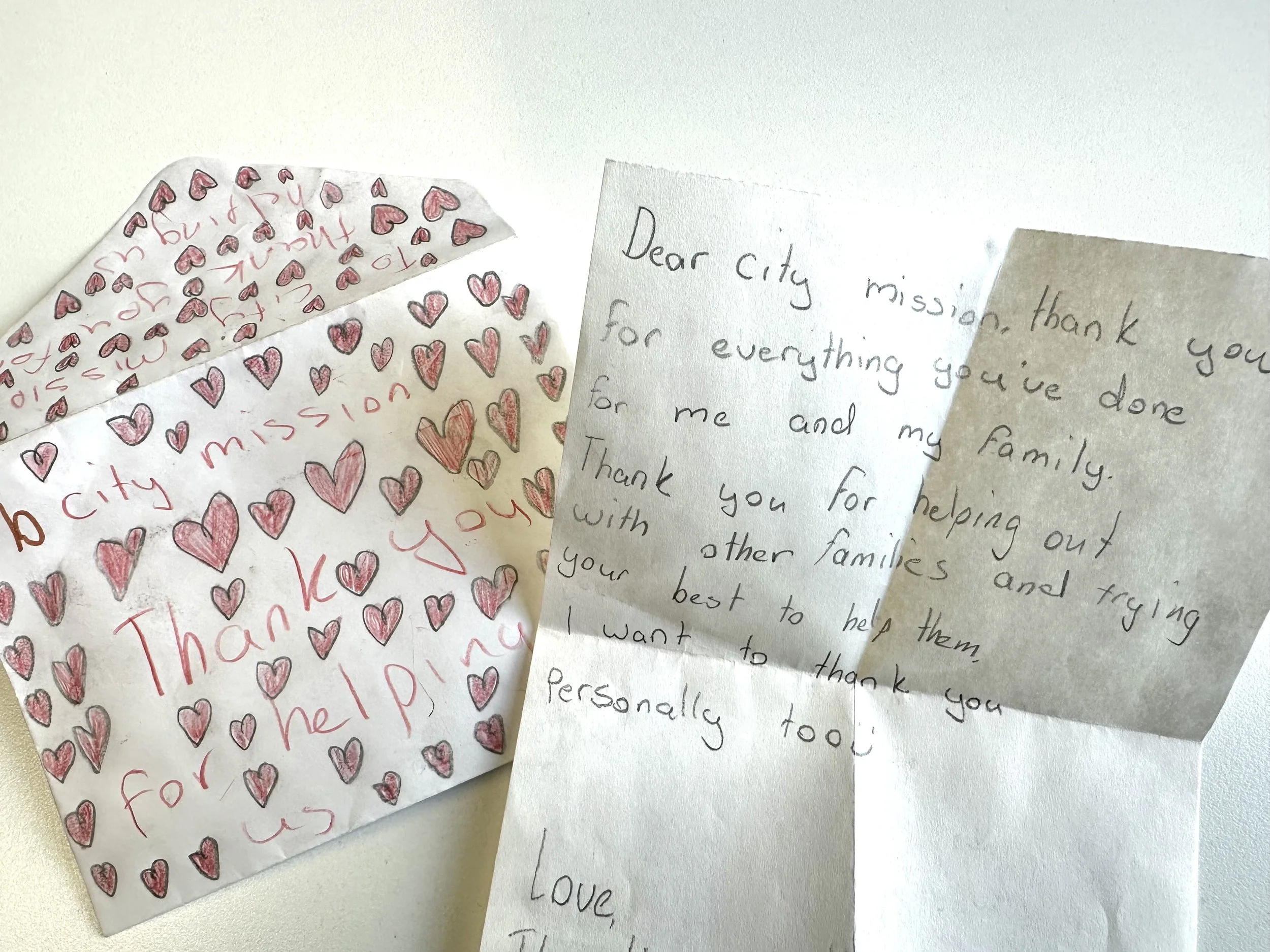 “Dear City Mission, thank you for everything you’ve done for me and my family. Thank you for helping out with other families and trying your best to help them. I want to thank you personally too.”
